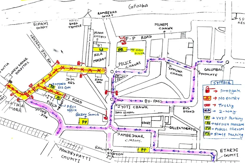 निर्देशानुसार न्यू सदर अस्पताल मोड़, मठिया मोड़, आईटीआई मोड़, सेंट्रल जेल मोड़, हवाई अड्डा मोड़, नाथ बाबा पुल पुलिस चौकी (थाना चौक), ज्योति चौक, थाना चौक, रामरेखा घाट तथा डीएवी मोड़ से आईटीआई मोड़ तक के मार्गों पर वाहनों का प्रवेश प्रतिबंधित रहेगा। इन मार्गों पर केवल कार्यक्रम में शामिल होने वाले आधिकारिक वाहनों और आवश्यक सेवाओं को अनुमति दी जाएगी।